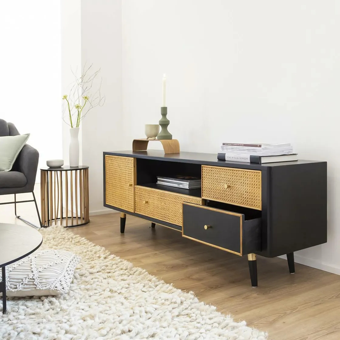 Les pieds et son encadrement sont conçus en MDF et le meuble dispose d’un support en métal afin de lui assurer une robustesse sans égale. Il vous offrira de nombreuses possibilités de rangements grâce à ses 3 tiroirs dont 2 possèdent une façade en cannage. Ils vous permettront d’y stocker vos DVD et jeux vidéo. Sa niche centrale vous permet d’y ranger votre box ou votre console pour les gamers ! N’oublions pas sa porte située à droite qui accueillera sans difficulté votre vaisselle.