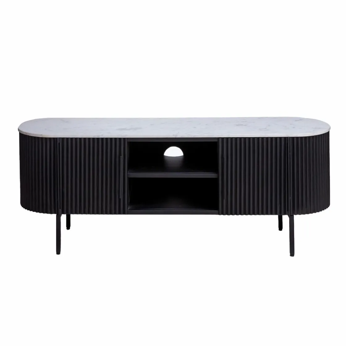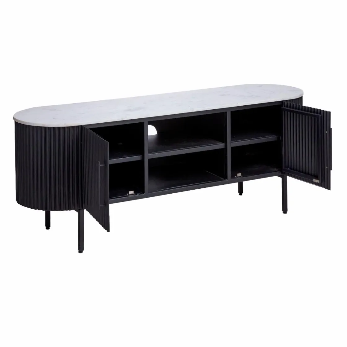 Les deux compartiments ouverts au centre vous permettent d’exposer vos objets de décoration préférés, tandis que les deux compartiments fermés de chaque côté vous offrent un espace de rangement pratique pour dissimuler les câbles et autres accessoires.