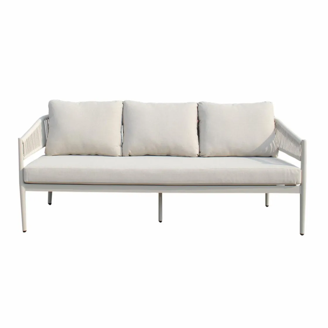 Sa structure en aluminium est associée à des dossiers et accoudoirs en corde, pour un look à la fois naturel et élégant. Une table basse complète l’ensemble, tandis que les coussins confortables ajoutent une touche de douceur. Un choix parfait pour créer un espace extérieur chaleureux et tendance.