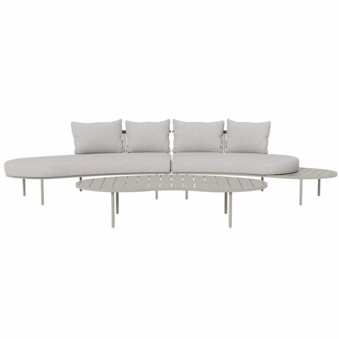 Le salon de jardin Zion allie style et confort avec sa table et son canapé en aluminium taupe, au design en forme organique, parfait pour cette année 2025. Le dossier du canapé en corde ajoute une touche subtile et design, tandis que les coussins offrent un confort optimal pour des moments de détente.