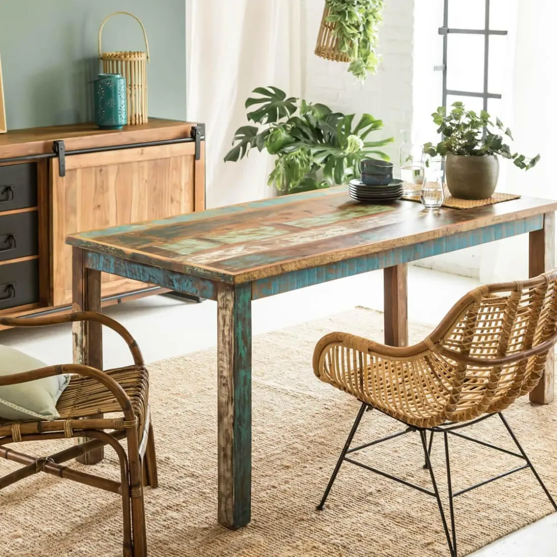 Cette table à manger possède une structure en bois recyclé coloré. Ses dimensions standard vous permettront de recevoir 6 personnes et ainsi de partager de bons moments autour d’un repas en famille ou entre amis. Le bois coloré, lui, apportera chaleur et convivialité à votre pièce.