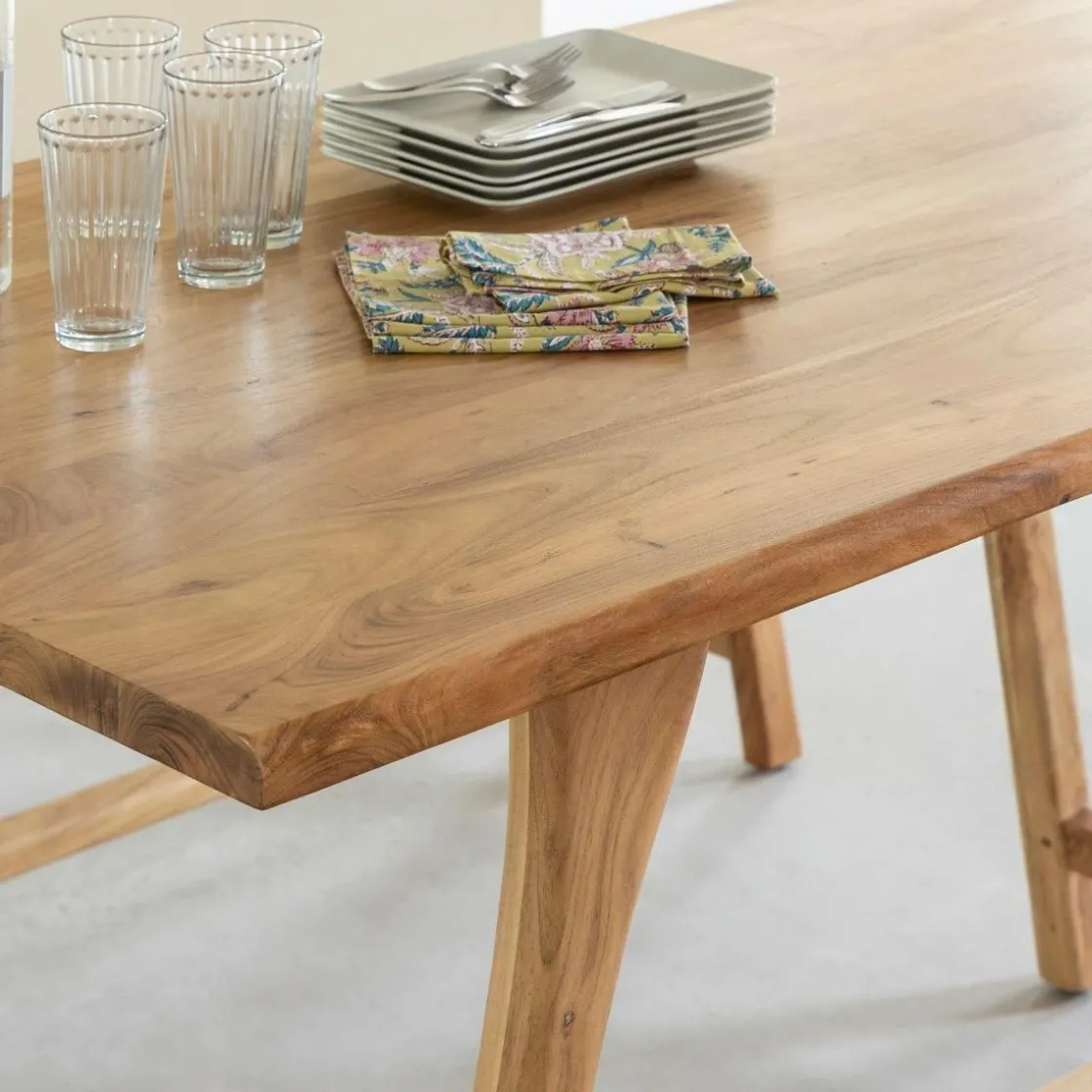 Apportez chaleur, caractère et convivialité à votre salle à manger ou votre cuisine avec ce lot comprenant une table haute Orane et deux bancs assortis. Confectionné en bois d’acacia massif, chaque élément affiche une teinte miel élégante et un veinage unique qui confère une véritable âme à l’ensemble.