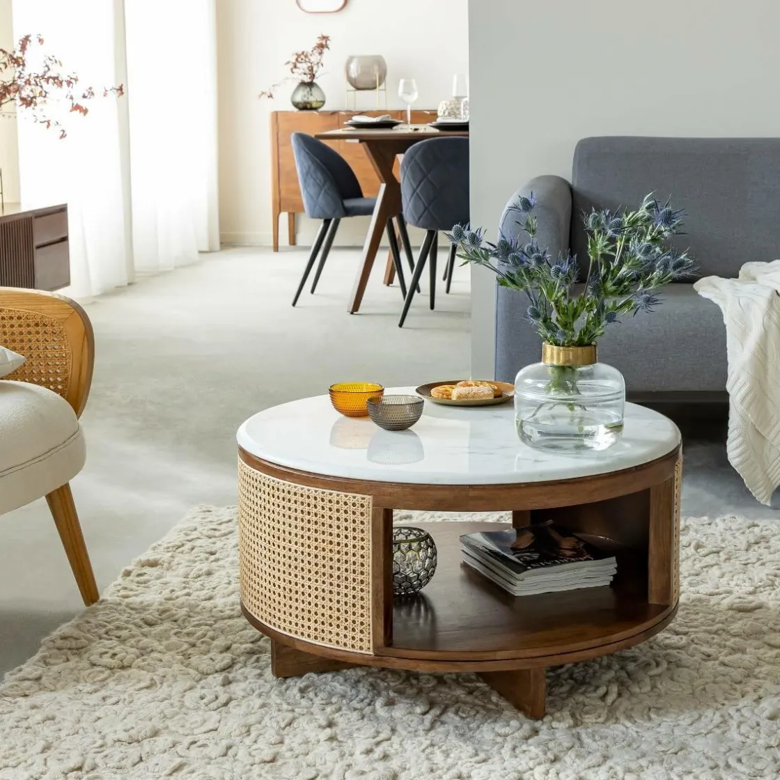 La table basse Brook offre un mariage harmonieux entre le contemporain et le vintage, avec son plateau en marbre blanc et sa structure en bois de manguier et cannage. De forme ronde, elle apporte une touche d’originalité à votre espace.