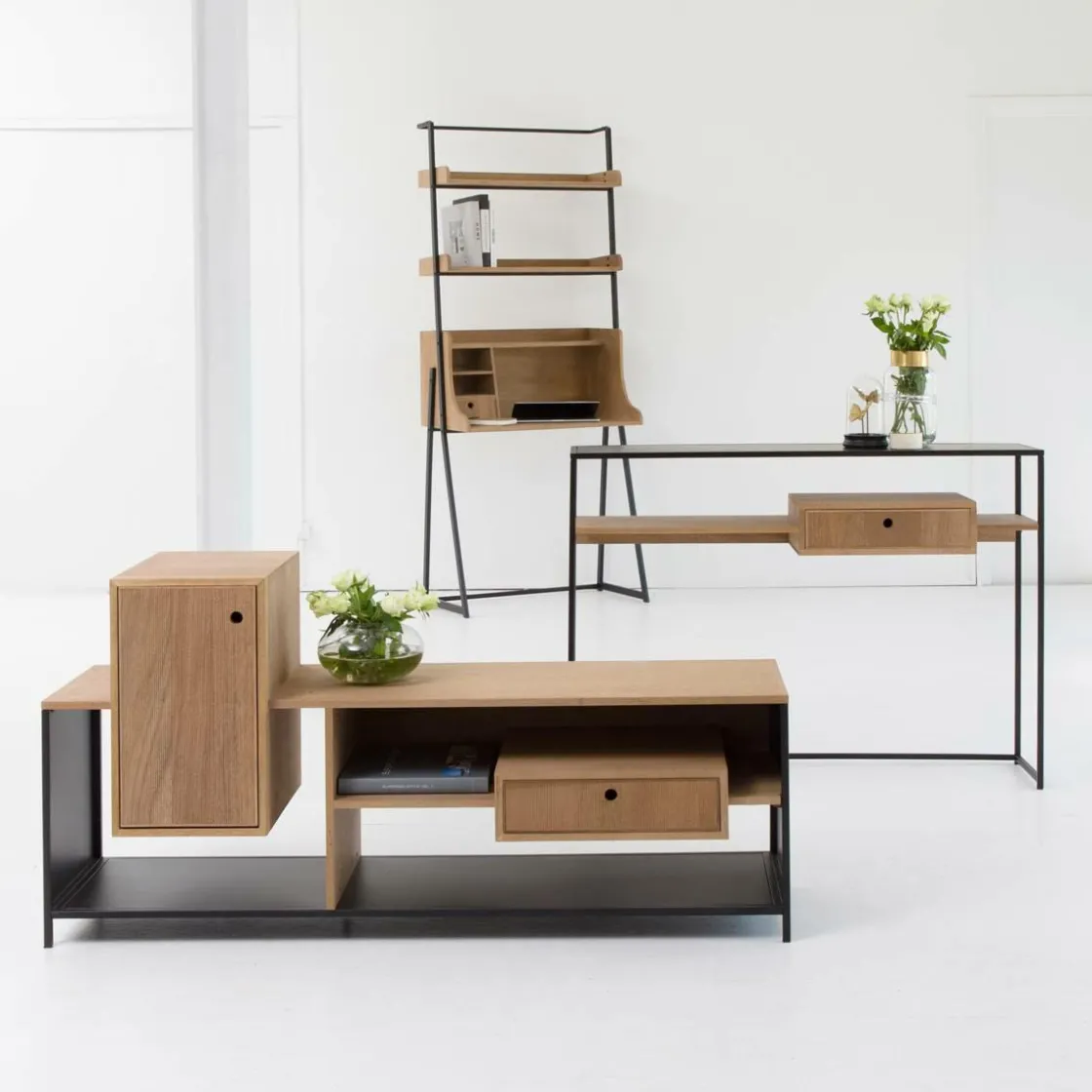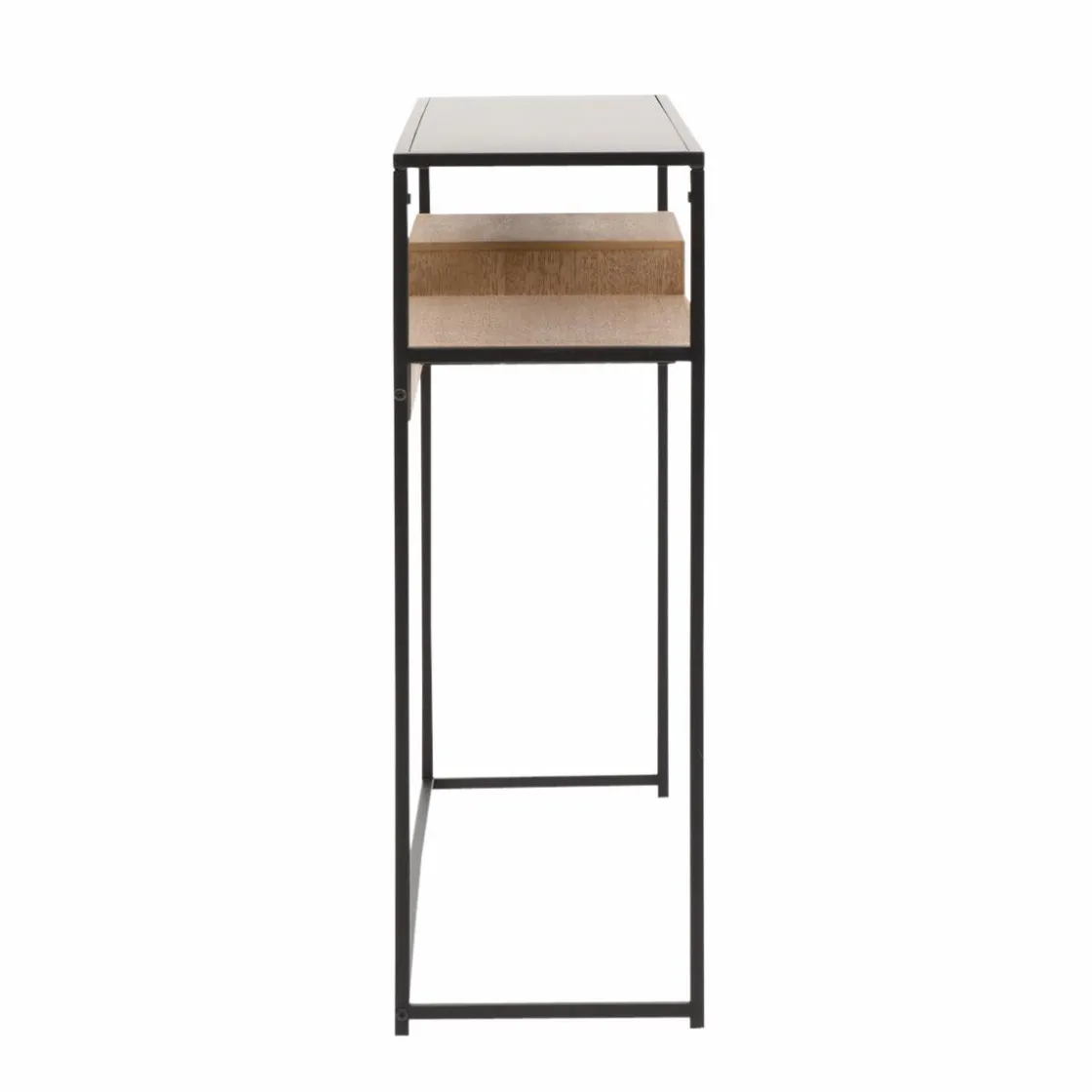 Ni trop grande, ni trop petite, elle vous propose des dimensions parfaites qui vous permettront de décorer un espace restreint ou inoccupé. Très pratique, son double-plateau vous offrira un espace supplémentaire pour ranger. A savoir que le plateau principal est en métal noir, alors que le second plateau est en frêne et MDF. Sa structure en métal noir est très marquée et affiche un caractère industriel que l’on aime beaucoup. Quant à son tiroir, il vous propose des solutions pour stocker joliment.