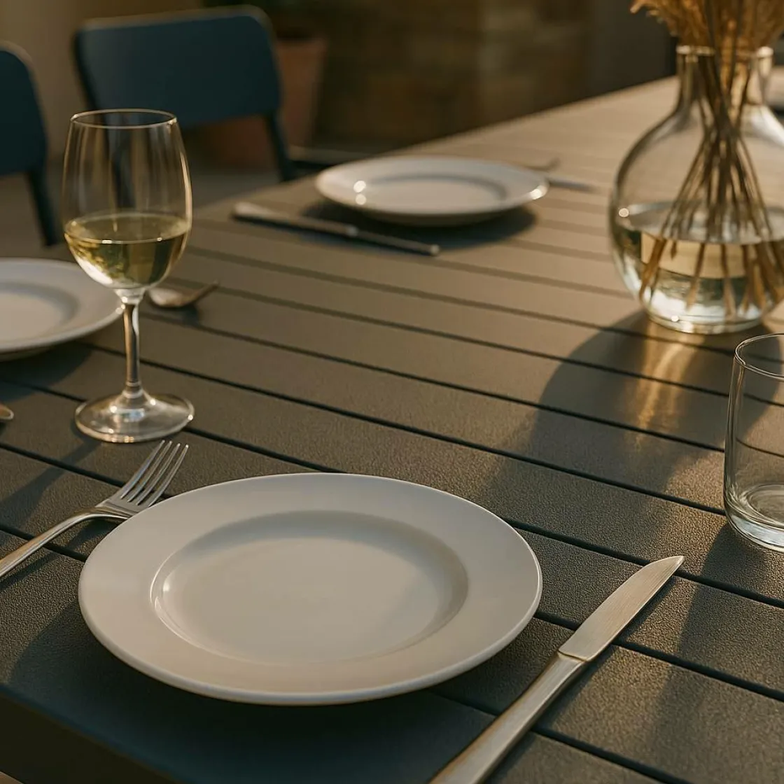 Fabriquée en aluminium, elle est légère, robuste et résistante aux intempéries. Son plateau à lattes modernes assure un excellent drainage et facilite l’entretien, ne nécessitant qu’un simple coup d’éponge pour rester impeccable.