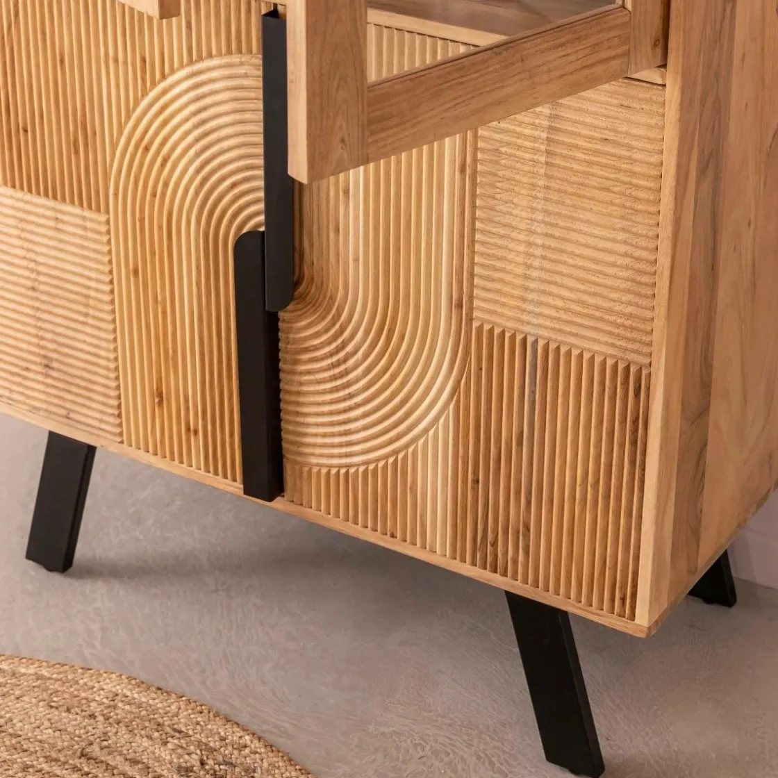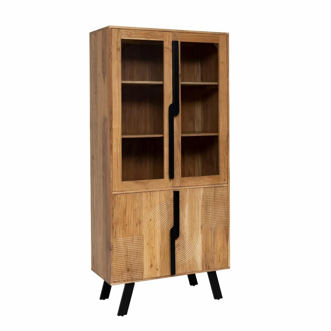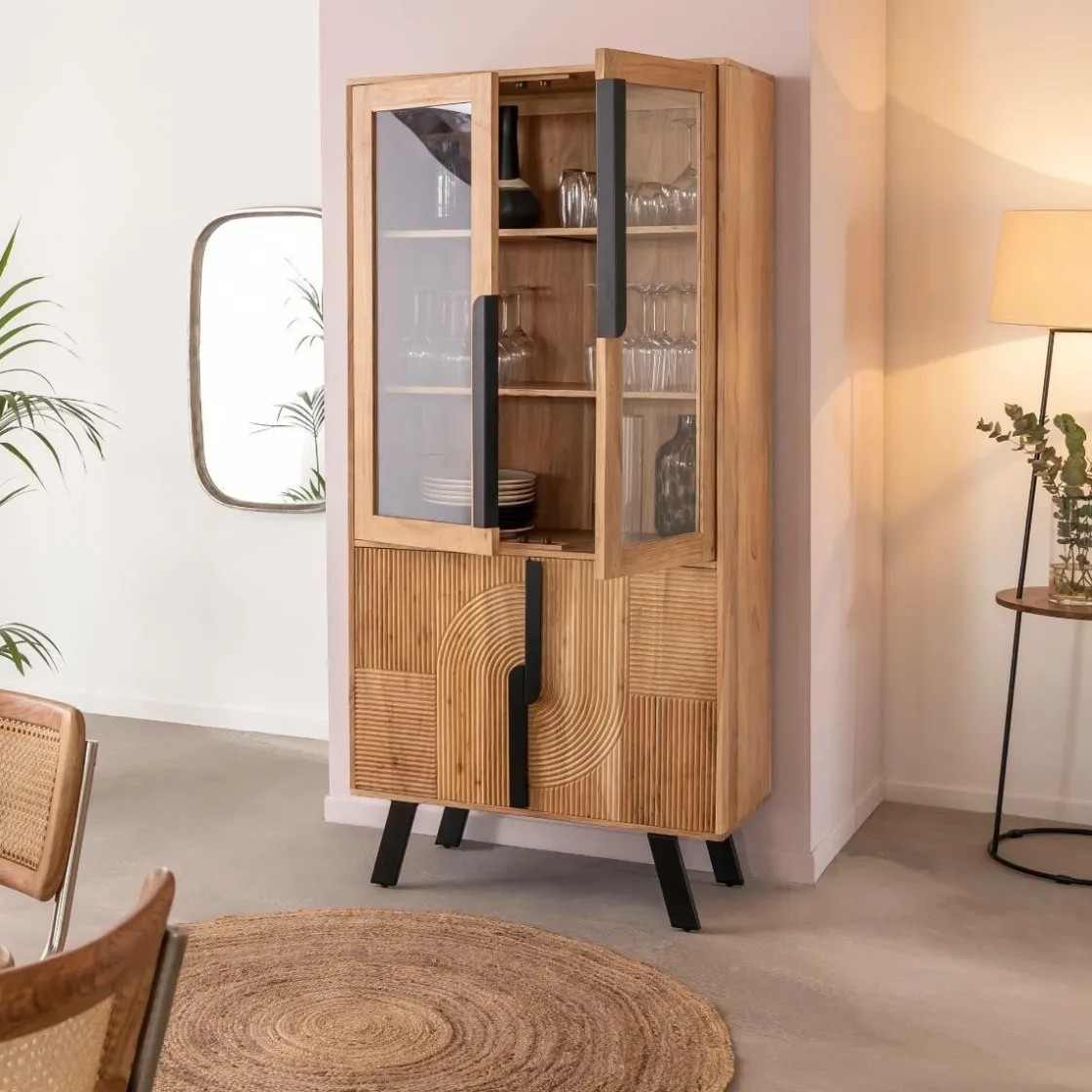 La vitrine Mano incarne le mariage parfait entre le style industriel et scandinave. Fabriquée en bois d’acacia, elle présente deux portes vitrées et deux portes effet baguette, offrant ainsi un espace de rangement fonctionnel et esthétique.