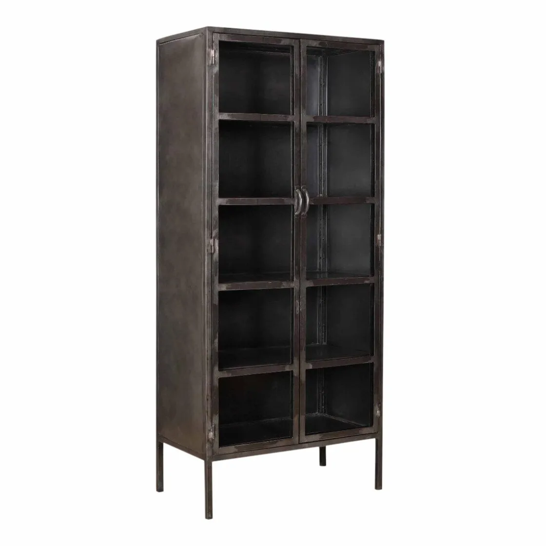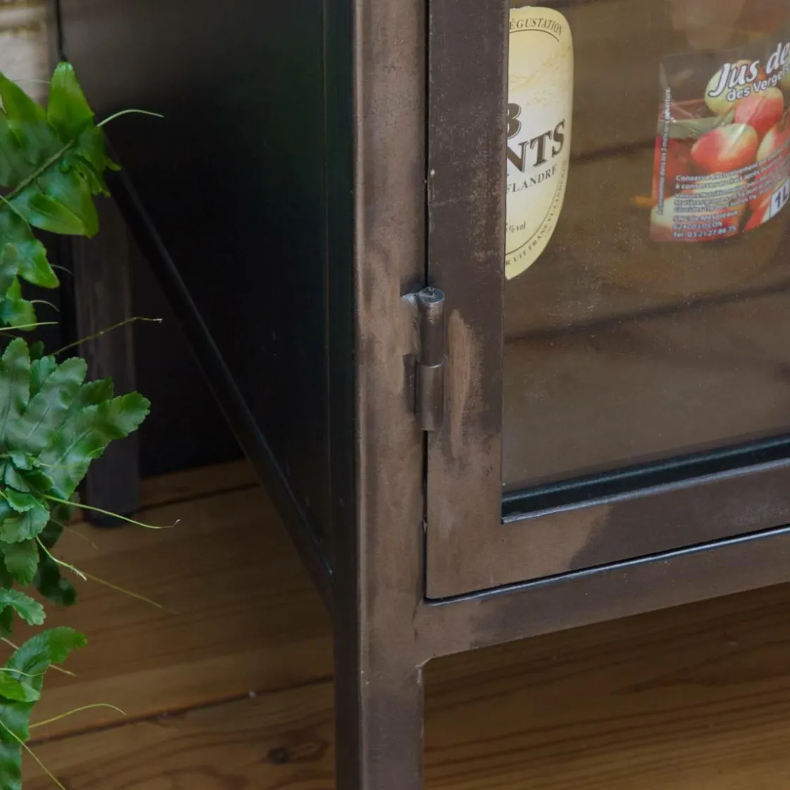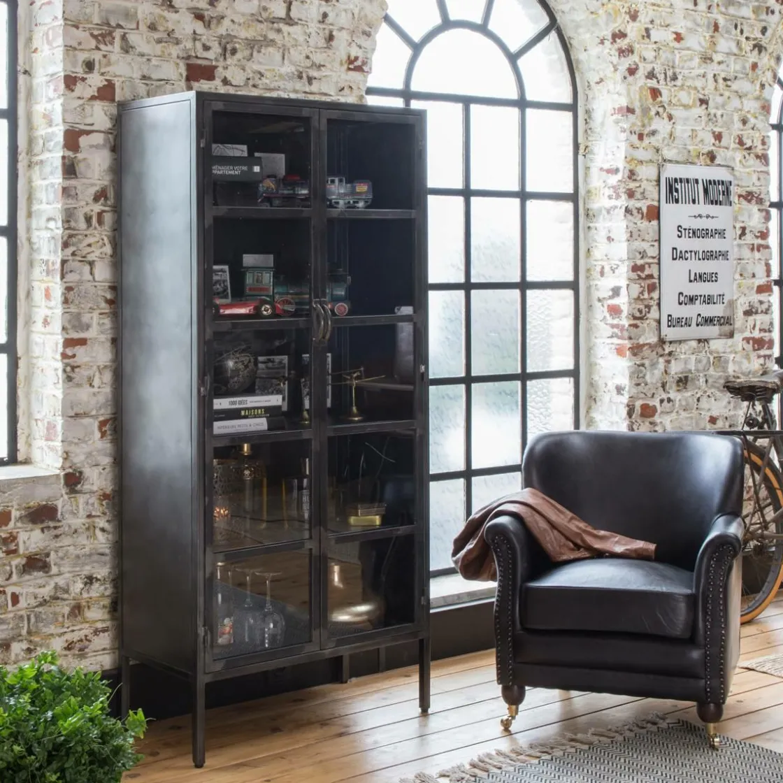 Conçue entièrement en métal noir grisé, ce meuble est d’une robustesse sans faille. A l’instar d’un buffet vaisselier, ses portes vitrées qui permettent de décorer subtilement. Elles sont idéales pour mettre en valeur votre vaisselle ou encore vos objets de décoration. Ses 4 étagères fixes optimisent l’espace et donnent lieu à 5 compartiments de la même taille.